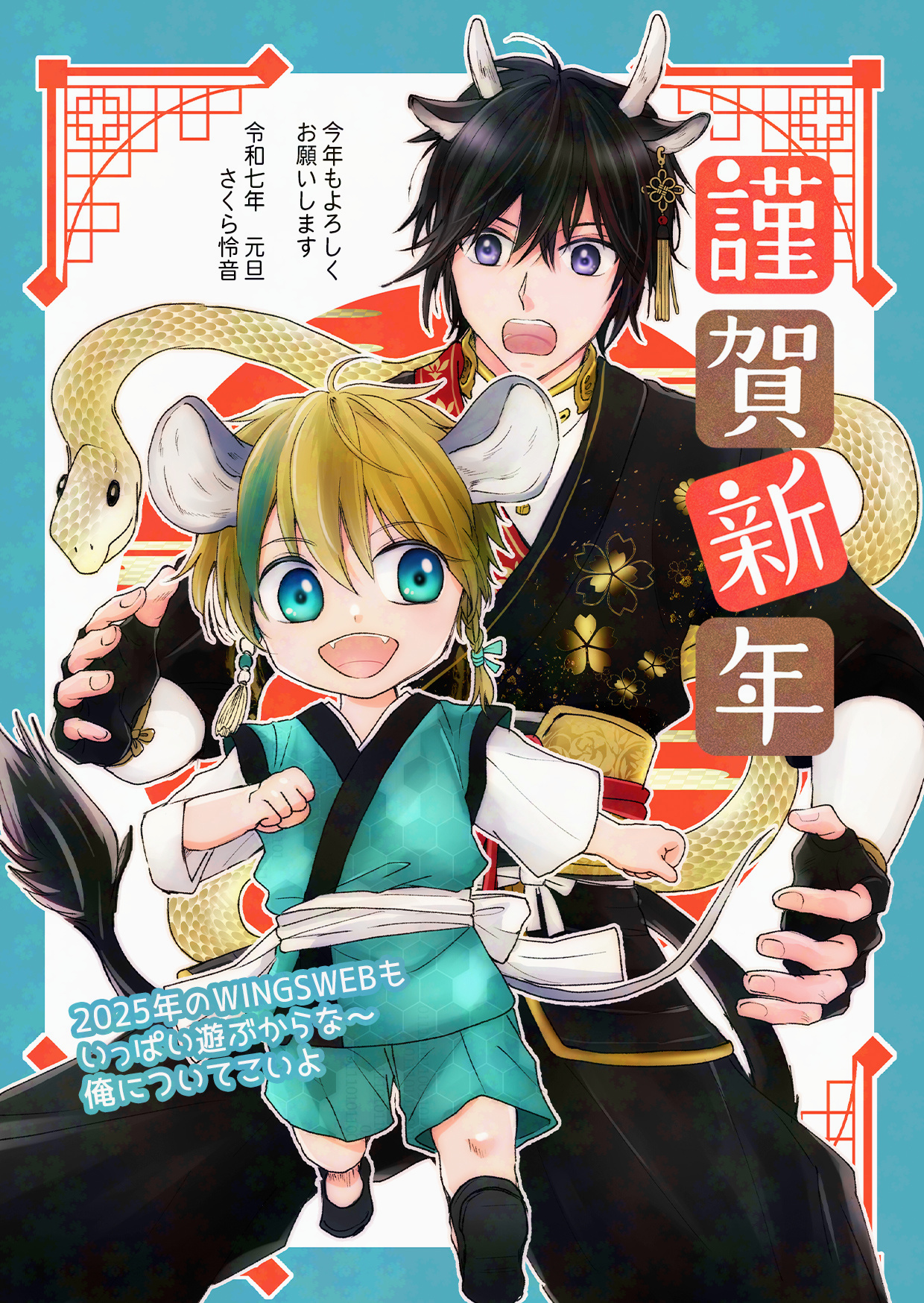 PICTUREイラスト2025-01-05謹賀新年 2025年wingsイラスト獣人化十二支パロ保存する共有:2025年はWINGSWEB10周年の記念イヤーです。何かできるといいな!今年もどうぞよろしくお願いします。子と丑&神様(巳)のトリオでお正月をお迎え。関連するお勧め投稿