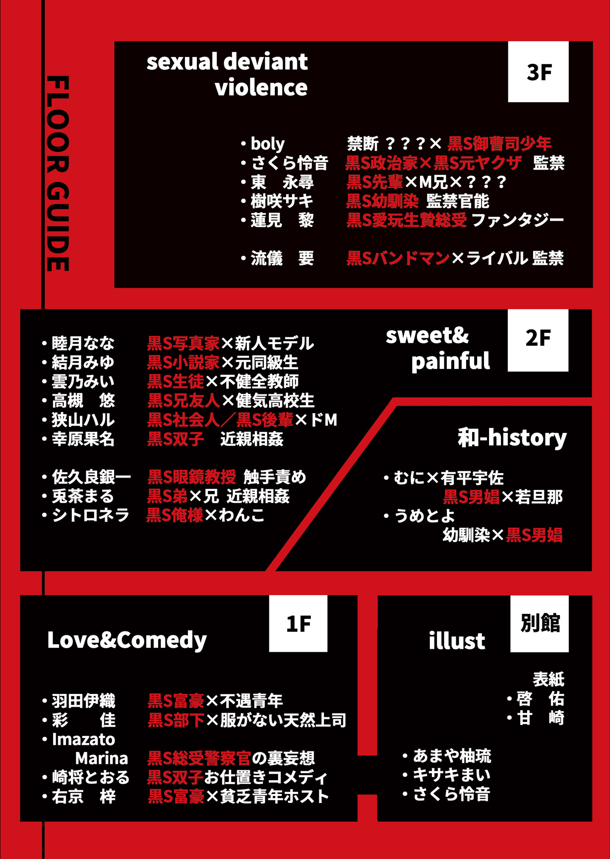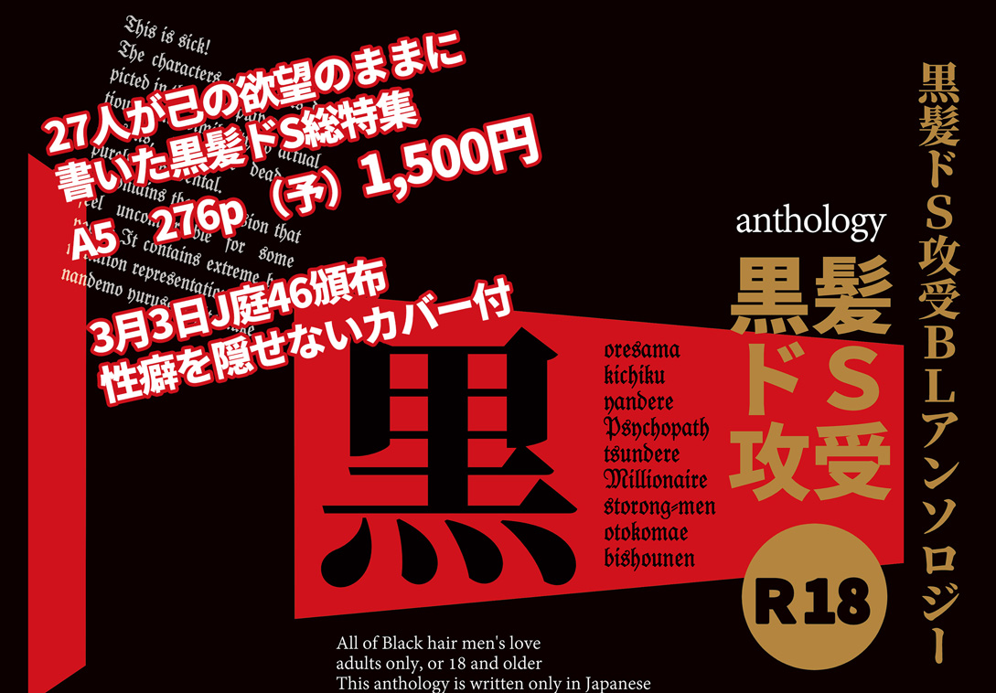 黒髪ドS攻受BLアンソロジーいらっしゃいませ。黒髪ドSキャラが攻めたり攻めたり攻められたり嬲られたりする特殊性癖のアンソロジーワールドへようこそ。執筆陣×作品傾向リストがすぐにわかる、フロアガイドはこちらでございます。3/3 Jgarden46新刊 A5 オフセット 276ページ 1500円性癖を隠せない、だがしかし何やら実用本に擬態してる気がするカバー付イベント頒布情報/通販情報/サンプルは2月中旬を予定。こうご期待♪